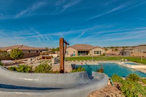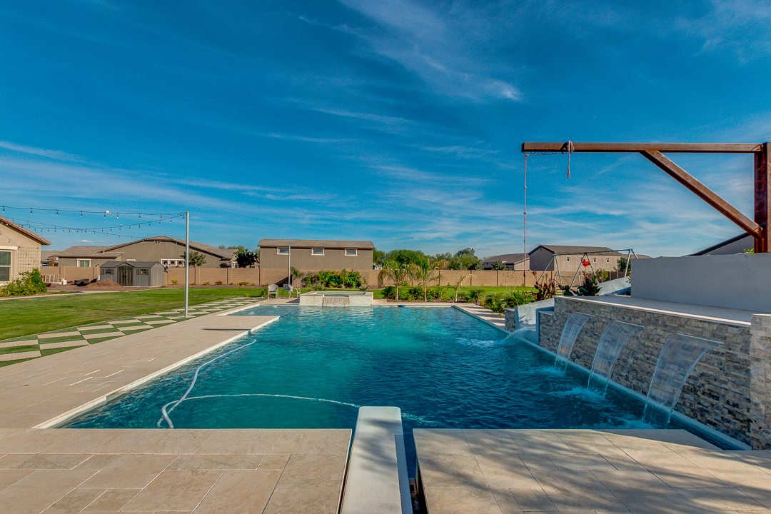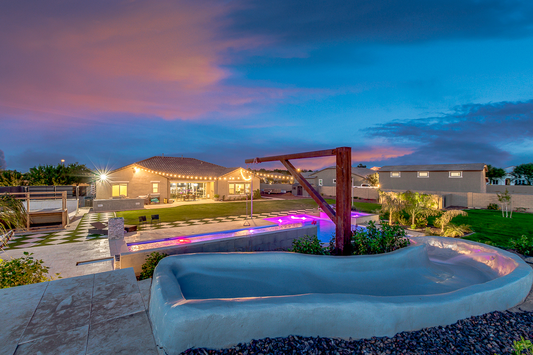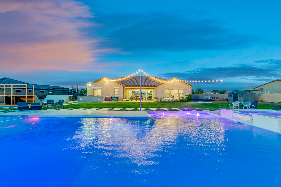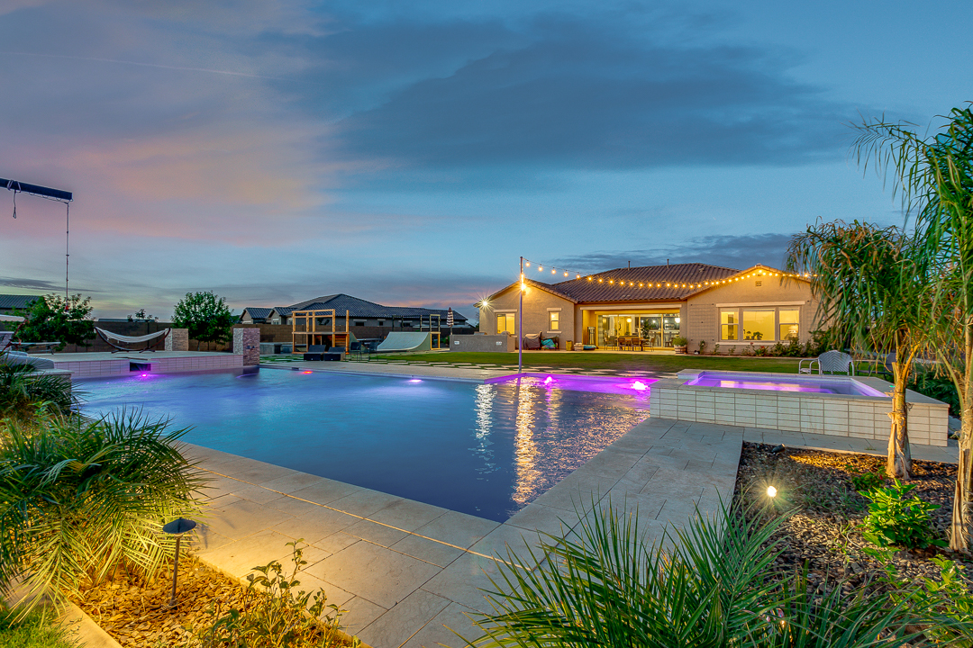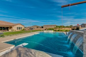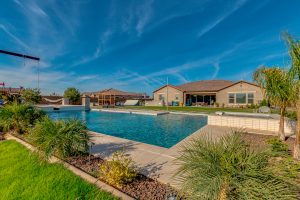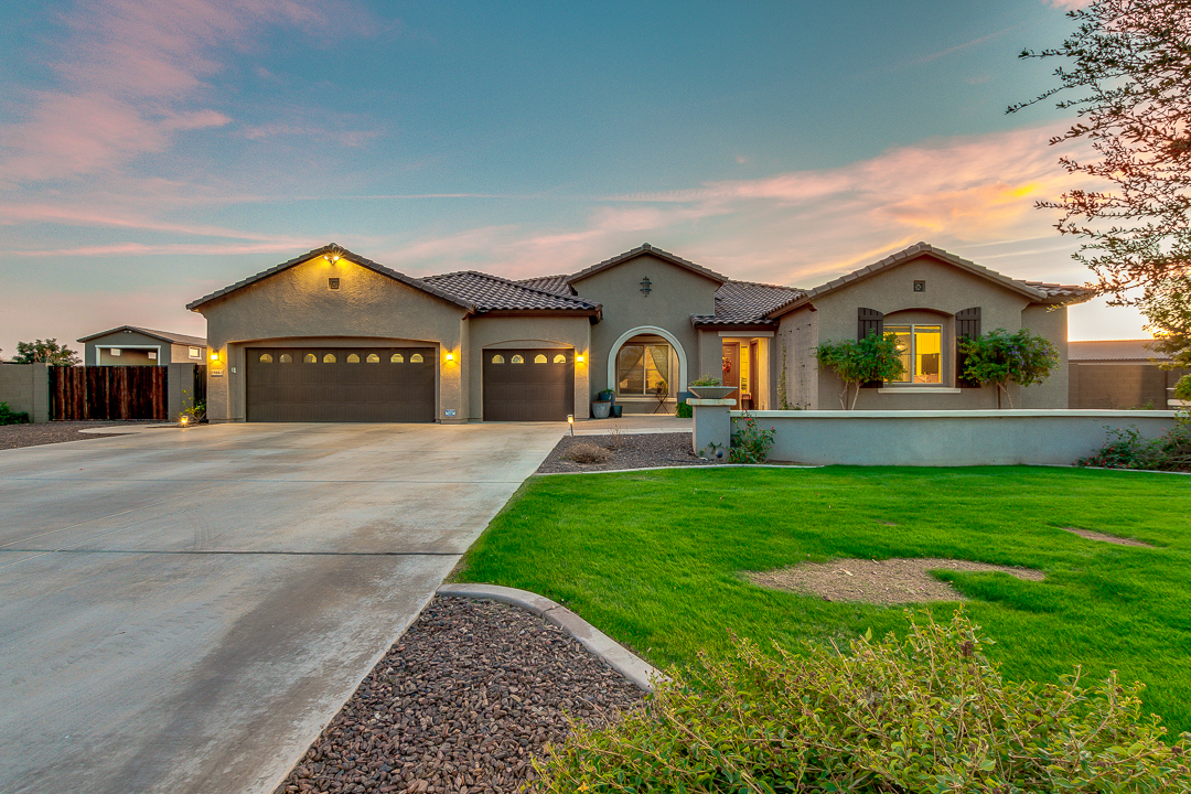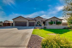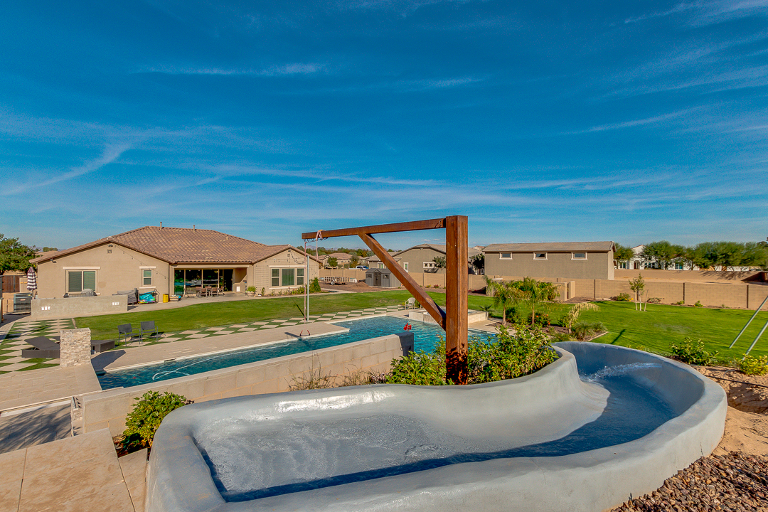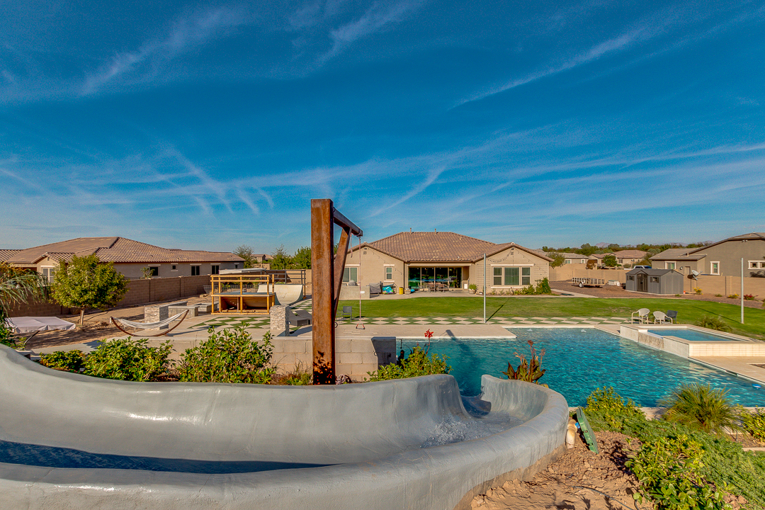 Wait until you see this gorgeous home! Just inside Queen Creek on an acre lot close to all major shopping areas and South 202 access. This home has everything, including a resort-style backyard with a massive pool featuring a diving platform, rope swing and a beautiful spa. Inside, you will find a large master suite where you will be blown away by a luxurious walk-in shower, dual sinks and his and her walk-in closets that connect to the laundry room, 4 large bedrooms and a guest suite with a private bath and sitting room. The open concept gourmet kitchen centers around a beautiful granite island, a spacious pantry, and stainless steel appliances, all of which connect to a great room allowing for outdoor-indoor living with large sliding glass doors that open to the beautiful back patio.
